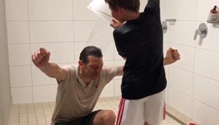 Trainer Thomas Nick musste nach dem verdienten Sieg und einer erfolgreichen Meisterschaft unter die Dusche. Die SpielerInnen hatten sichtlich ihren Spaß bei der Aktion.