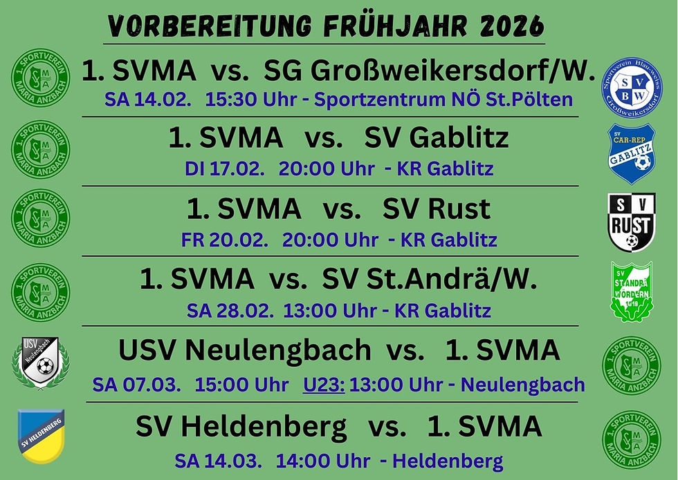 Los geht's bereits am 14. Februar mit dem ersten hochkarätigen Gegner SG Großweikersdorf/Wiesendorf aus der 2. Landesliga West, wo in St.Pölten im Sportzenrum NÖ gespielt wird. Weitere Vorbereitungsspiele gegen Gablitz, Rust und St.Andrä/W. finden am Kunstrasenplatz in Gablitz statt. Im März heißt es dann wieder Derbytime, wo wir bei unseren Nachbarn im Wienerwaldstadion zu Gast sein werden. Zum Abschluss der Vorbereitung findet das letzte Testspiel in Heldenberg statt.
